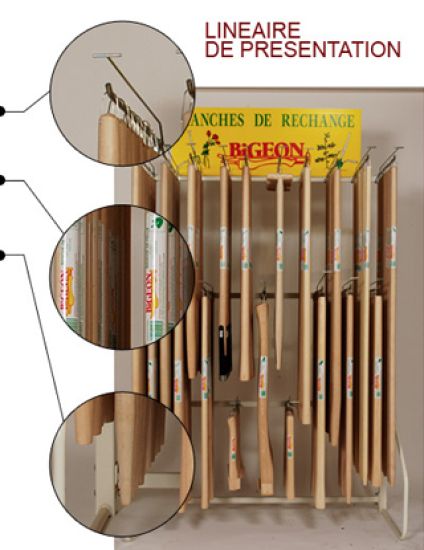 Notre concept de présentation, spécialement étudié pour la vente de manches d’outils en magasin (jardinerie, quancaillerie, coopérative agricole, grande surface), permet d’installer nos produits dans vos gondoles, de manière rapide et aisée.